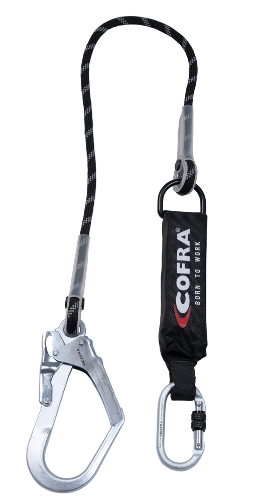 ORLIK 2 m- Cordino singolo con assorbitore di energia integrato, certificato per carichi nominali estremi compresi tra 40 kg e 140 kg. Equipaggiato con un connettore di base in acciaio e un connettore di ancoraggio in acciaio. Corda statica da 11 mm di diametro.