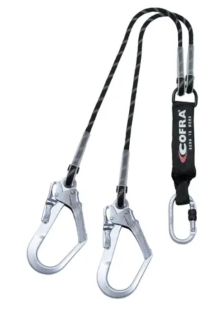 MEDFORD- Cordino doppio con assorbitore di energia integrato, certificato per carichi nominali estremi compresi tra 40 kg e 140 kg. Equipaggiato con un connettore di base in acciaio e due connettori di ancoraggio in acciaio. Corda statica da 11 mm di diametro.